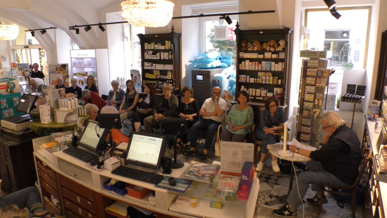 Mit Friedrich Hahn und seiner Dichter Meile in Alsergrund und mit seinen Gästen Christoph Braendle und Richard Pils. Peter Paul Wiplinger stellt sein Buch „Schachteltexte“ dar.