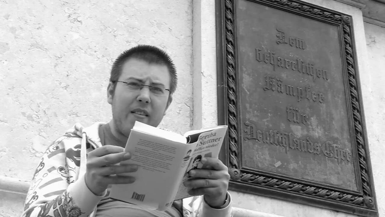 PassantInnen und prominente Persönlichkeiten lesen aus Bertha von Suttners Antikriegsroman. Diesmal liest Alexander Dubkowitsch am Heldenplatz aus "Die Waffen nieder".