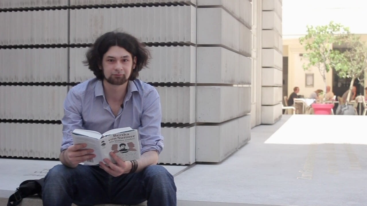 PassantInnen und prominente Persönlichkeiten lesen aus Bertha von Suttners Antikriegsroman. Heute liest der Student Dominik Brand eine Passage.