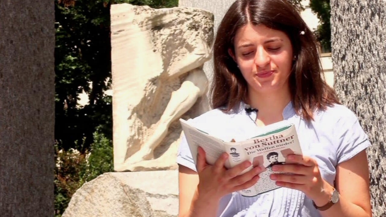 Milena Vesselinova liest heute vor dem "Tor der Gewalt" - dem Mahnmal gegen Krieg und Faschismus von Alfred Hrdlicka - aus Bertha von Suttners Antikriegsroman.