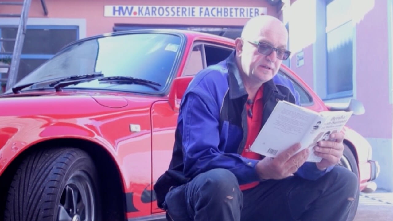 PassantInnen und prominente Persönlichkeiten lesen aus Bertha von Suttners Antikriegsroman. Heute: der Karosseur Hermann Wenigwieser.