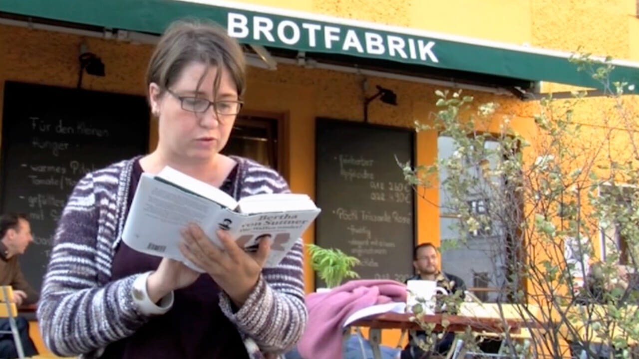 Carmen Herzog (Sprachwissenschaftlerin) liest vor der Brotfabrik Berlin Ost aus Bertha von Suttners Antikriegsroman "Die Waffen nieder!".