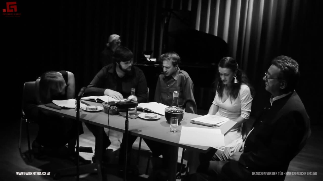 „Draussen vor der Tür“ – die gekürzte Version einer szenischen Lesung des Stücks von Wolfgang Borchert im Roten Salon der Oestig, mit Kristina Bartashova, Anne Frütel, Stanislaus Dick, Bernd Gordon, Marius Lackenbucher und Alfred Woschitz. Borchert starb am 20. November 1947 – einen Tag vor der Erstaufführung seines klassischen Stücks. In Borcherts Texten spielen Türen immer eine wesentliche Rolle – und meistens sind es Türen, die verschlossen sind und sich um keinen Preis mehr öffnen lassen.