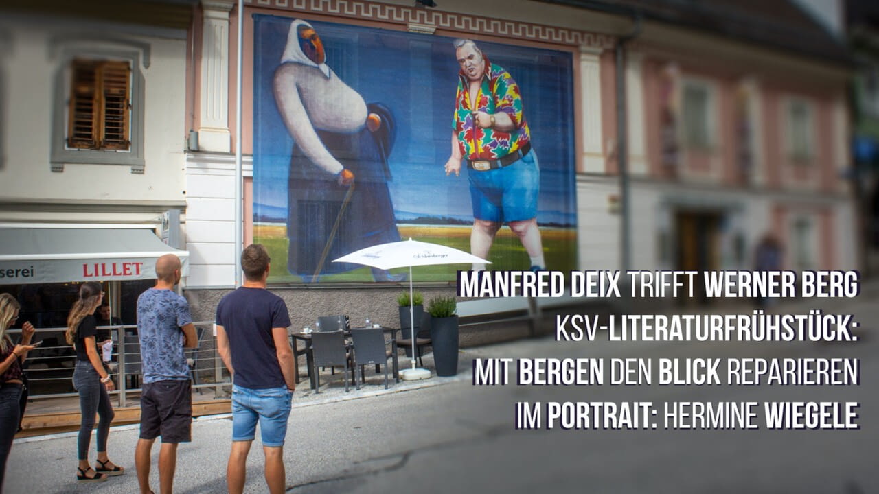 1.) Mit Bergen den Blick reparieren. Ein Besuch beim Literaturfrühstück des Kärntner SchriftstellerInnenverbandes zur Ausstellung im Künstlerhaus Klagenfurt. 2.) In Nötsch im Gailtal befindet sich im Haus Wiegele neben dem Museum des "Nötscher Kreises" auch eine Mühle und eine Bäckerei. Ein Portrait der guten Seele des Hauses: Hermine Wiegele. 3.) Manfred Deix trifft Werner Berg. Ein Besuch im Werner Berg Museum in Bleiburg, von sich die Oevres von Werner Berg und Manfred Deix gegenüberstehen.