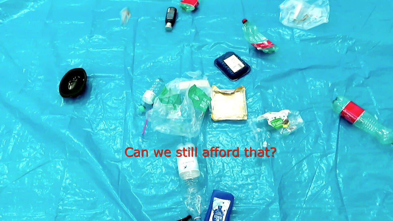 Auf eine das Meer symbolisierende blaue Folie fallen Plastiksackerl, Plastikflaschen, Plastikstrohhalme usw... - "Können wir uns das noch leisten" ist der Titel des ersten Teils der Kunstaktion "PLASTIKMÜLL" unter Mitwirkung von Ausstellungsbesuchern, die uns das verantwortungslose Verhalten der Gesellschaft in Form der gedankenlosen Verwendung und des Wegwerfens von Plastikmüll vor Augen führen, der sich vor allem in den Meeren schon seit geraumer Zeit zu einer immer größer werdenden Katastrophe ausweitet. Ein Film von Karin Hannak.
