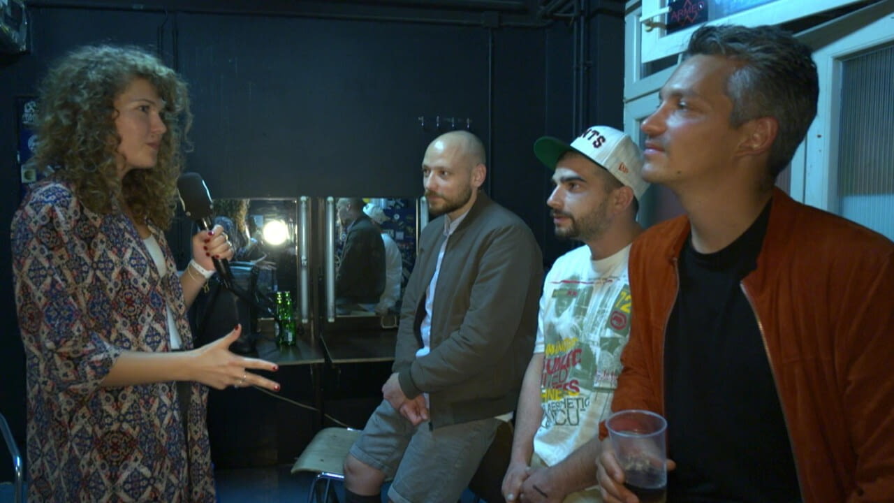 Alexandra Stanić spricht mit Hauptprotagonisten Faris Rahoma, Aleksandar Petrović und Mehmet Ali Salman über ihren Film "Die Migrantigen" beim Sommerfest der bosnisch-herzegowinischen Kulturplattform BHKP in der Szene Wien.