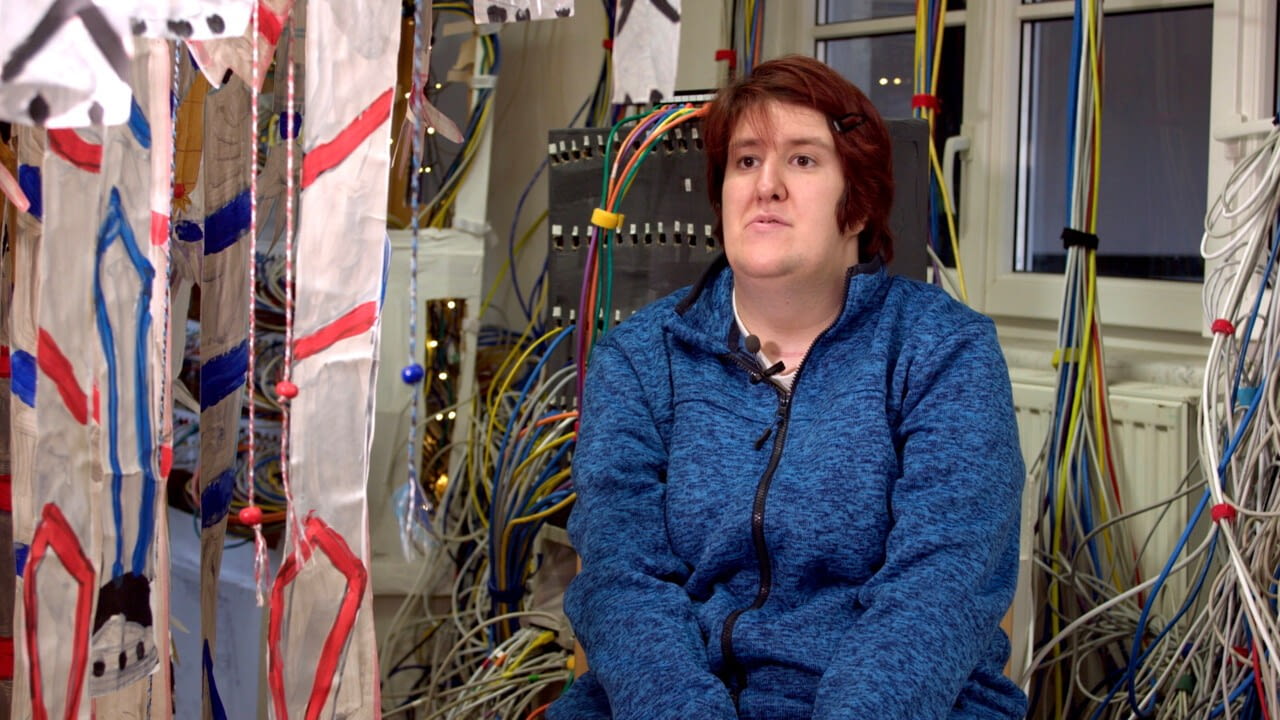 Ihre Werke gestaltet sie mit großer Hingabe und oft aus technischen Komponenten wie Netzwerkkabeln.